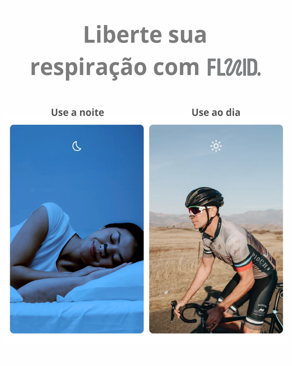 Respire melhor e aumente seu desempenho. O Fluid amplia o fluxo de ar pelas vias nasais, melhora a oxigenação e ajuda você a treinar com mais resistência e foco. Leve, discreto e reutilizável, é o aliado ideal para atletas e praticantes de esportes.